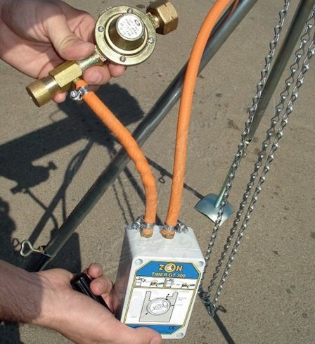 Электроника управляет коммутатором подачи газа, поэтому шланг, идущий от баллона, необходимо разрезать, а концы надеть на штуцеры, находящиеся в верхней части таймера (зажимы для шланга идут в комплекте). После этого остается только вставить батарейку типа "АА" и настроить расписание с помощью круглой поворотной шкалы — таймер готов к работе.