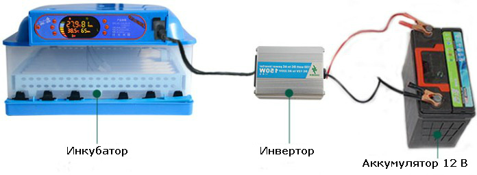 В отличие от аналогов, работающих только от сети 220 В, предлагаемая модель может питаться еще и от внешнего источника 12 В (например, от обычного автомобильного аккумулятора). К такому источнику инкубатор следует подключать через инвертор, который докупается отдельно. Питание от аккумулятора может потребоваться в тех случаях, когда имеются проблемы с электричеством.