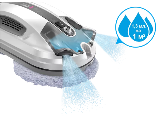 Hobot-R3 при запуске автоматически распыляет жидкость на стекло и опускается вниз предварительно смачивая края обеих салфеток. Робот мойщик окон может двигаться вверх более безопасно и устойчиво, благодаря увеличенной силе трения создаваемой влажными чистящим и салфетками.