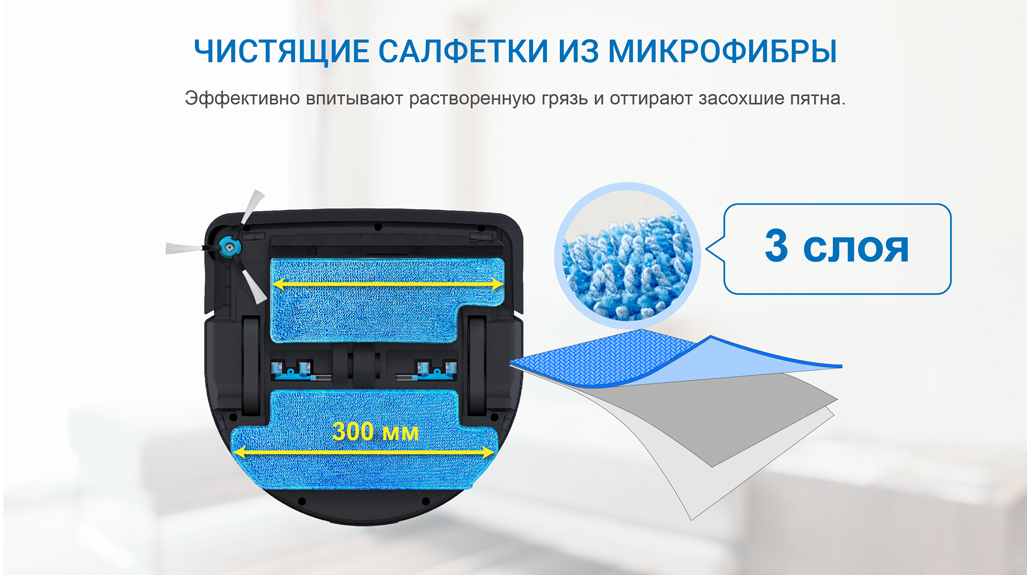 Мощный вакуумный пылесос всасывает мелкий мусор, волосы и шерсть домашних животных. Механизм привода с возвратно-поступательным движением обеих салфеток при колебании 10 раз в секунду имитирует движения рук для удаления засохших пятен и мусора с пола. Микрокапельное распыление воды – третья стадия уборки для размягчения засохших пятен и грязи, которые не удаляются при сухом протирании. Задняя чистящая салфетка не только впитывает влагу и вытирает пятна и грязь, но и полирует пол.