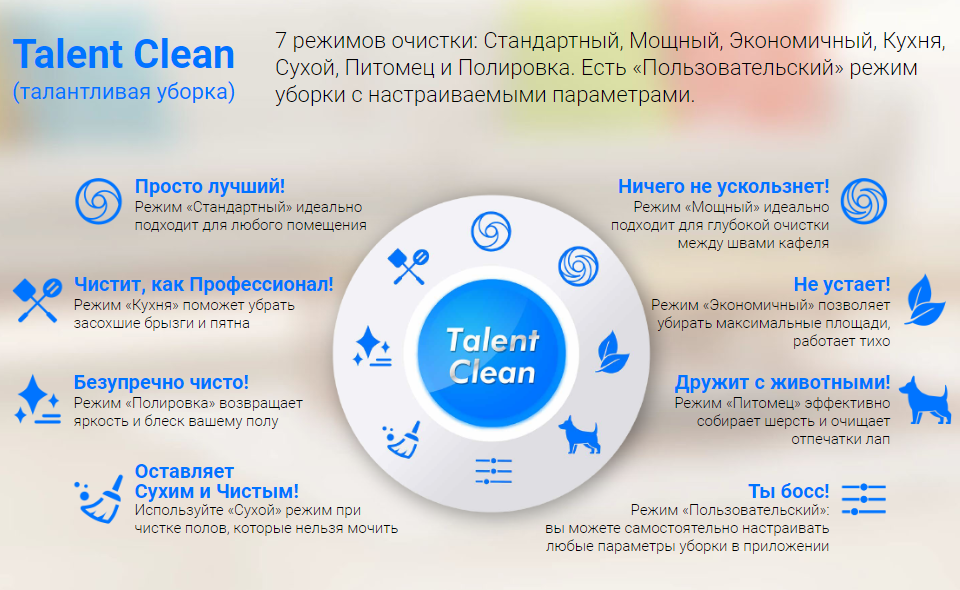 • Режимы умной очистки: Стандарт, Мощный, ЭКО, Кухня, Сухой, Домашние животные и Полировка